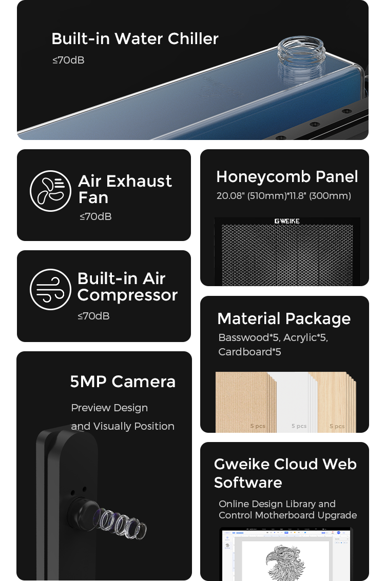 During normal printing, gweike cloud has an average noise level of about 70 dB(A). Equipped with a much quieter fan the speed can be adjusted automatically according to the real-time temperature, realizing a noise level decrease of about 16 dB(A)[3], so that you can truly focus on your making.