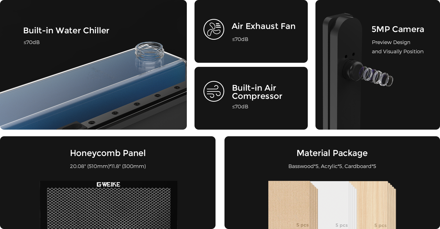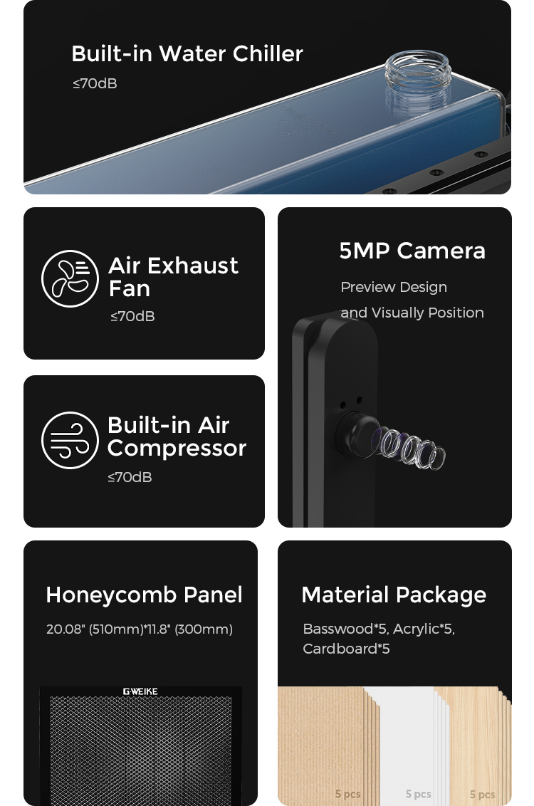 During normal printing, gweike cloud has an average noise level of about 70 dB(A). Equipped with a much quieter fan the speed can be adjusted automatically according to the real-time temperature, realizing a noise level decrease of about 16 dB(A)[3], so that you can truly focus on your making.