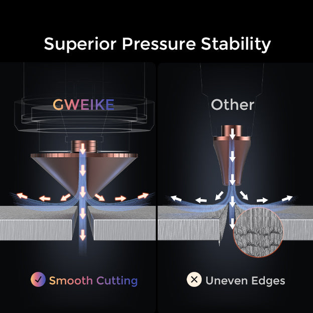 The powerful 1.5MPa gas jet delivers exceptional penetration capability, enabling smooth cutting of thicker materials with a maximum cutting thickness of 6mm. The high-pressure airflow instantly expels molten metal, significantly reducing plate preheating time while increasing carbon steel cutting speed. The enhanced gas stream thoroughly removes slag, achieving outstanding cut surface quality with roughness (Ra) ≤3.2μm for optimized edge finishing.